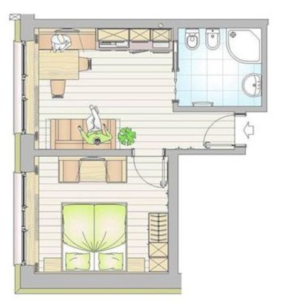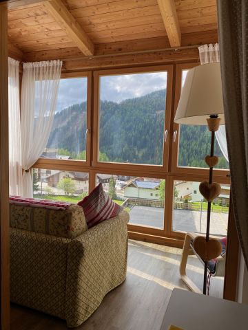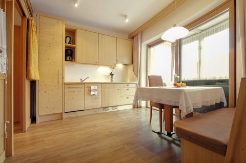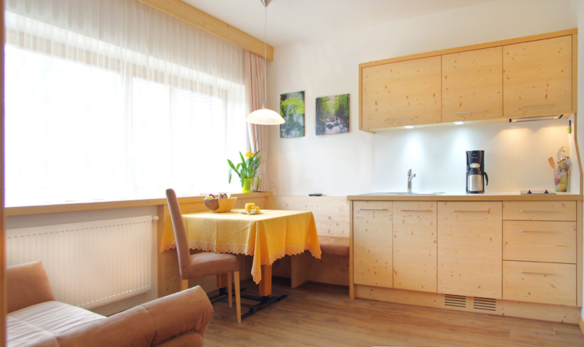 Questo appartamento si trova al pianoterra e può ospitare 3 persone. È composto da una camera da letto matrimoniale e da una cucina abitabile con divano letto singolo. Il bagno dispone di doccia, WC e bidet. L’alloggio è molto luminoso e grazie alle sue grandi finestre offre una bella vista sulle montagne.