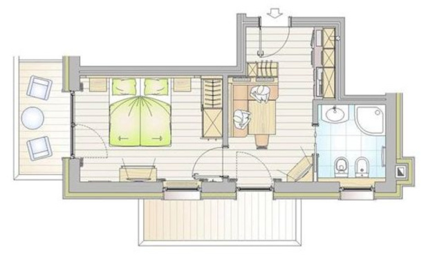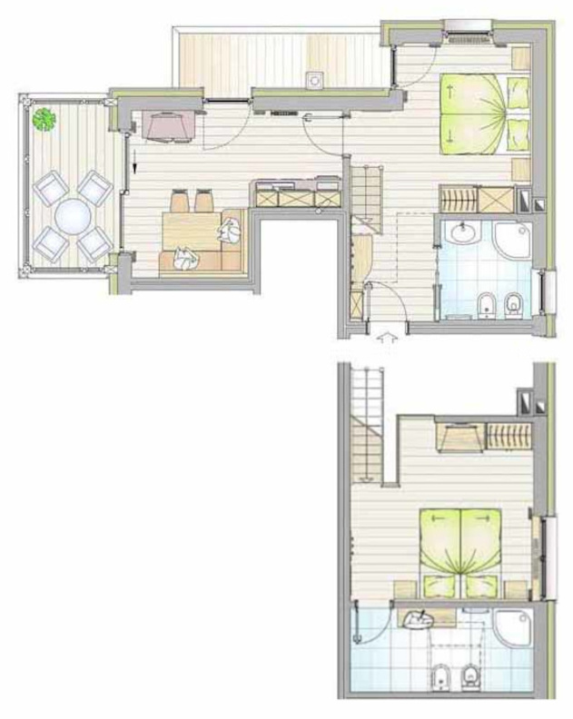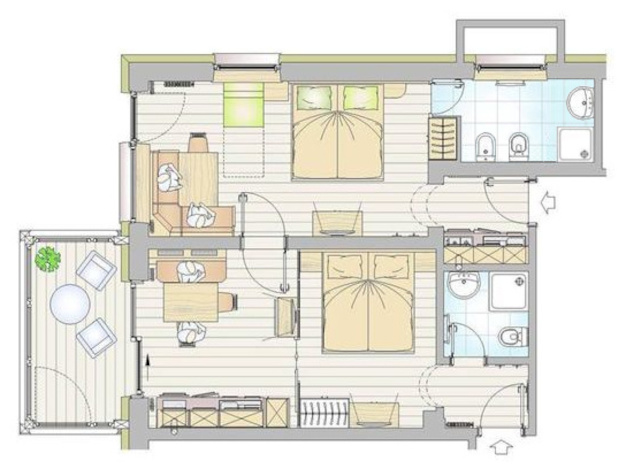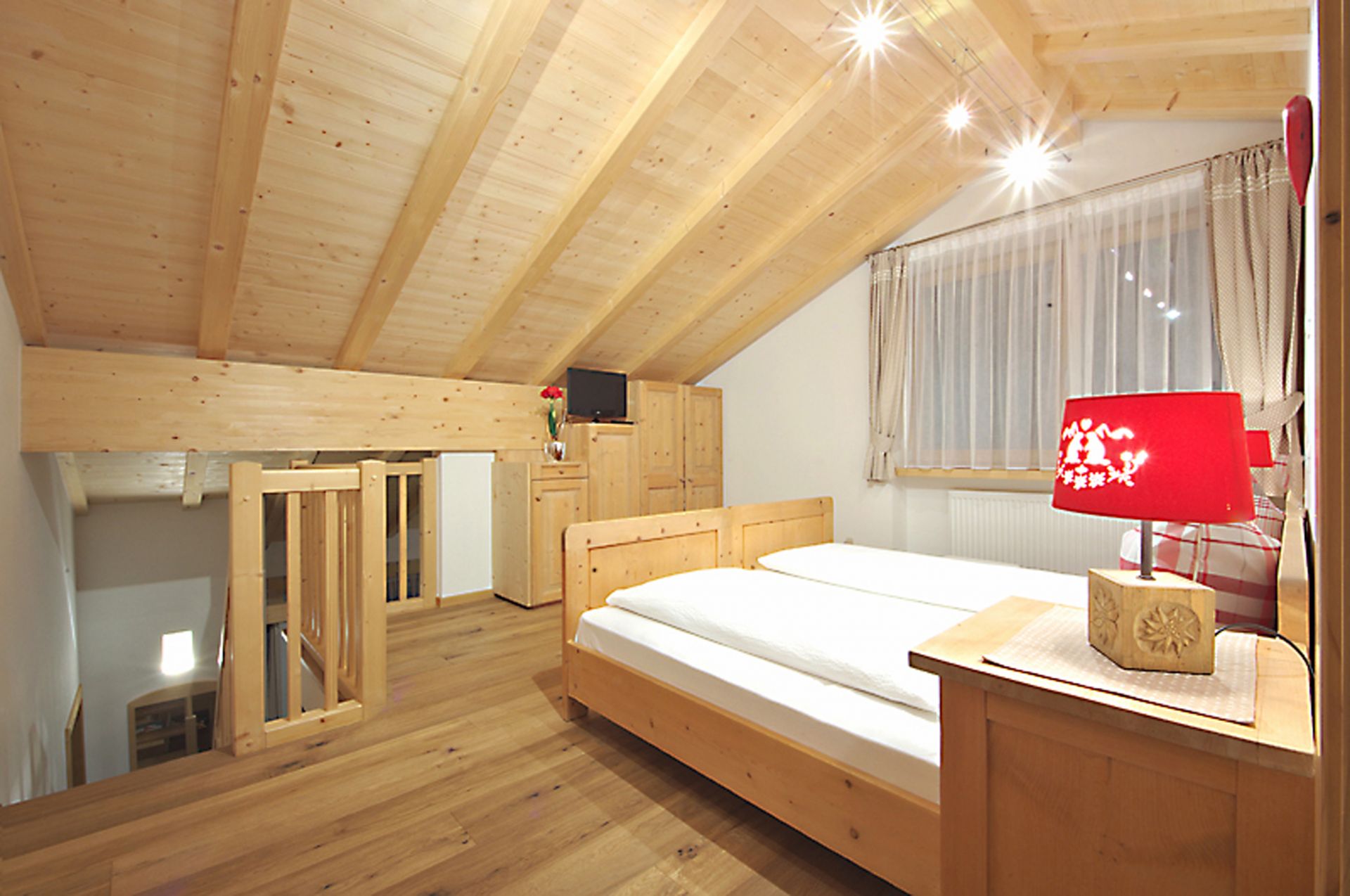 Questo appartamento, situato al secondo piano, è un appartamento su due livelli che può ospitare 4 persone. È ideale per famiglie, dato che è un’open space. Inoltre, dispone di una cucina completamente attrezzata e di una veranda panoramica con una magnifica vista sul Gruppo del Sella. I 2 bagni sono dotati di doccia, WC e bidet.